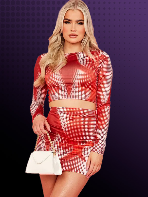Turn up the heat with this eye-catching red illusion print co-ord! Featuring a sleek long-sleeve crop top and a figure-hugging mini skirt, this set brings futuristic vibes with a digital-inspired pattern. The stretchy, contouring fabric ensures a snatched fit, making it perfect for nights out, parties, and bold fashion moments.