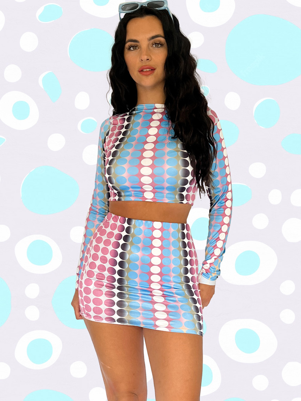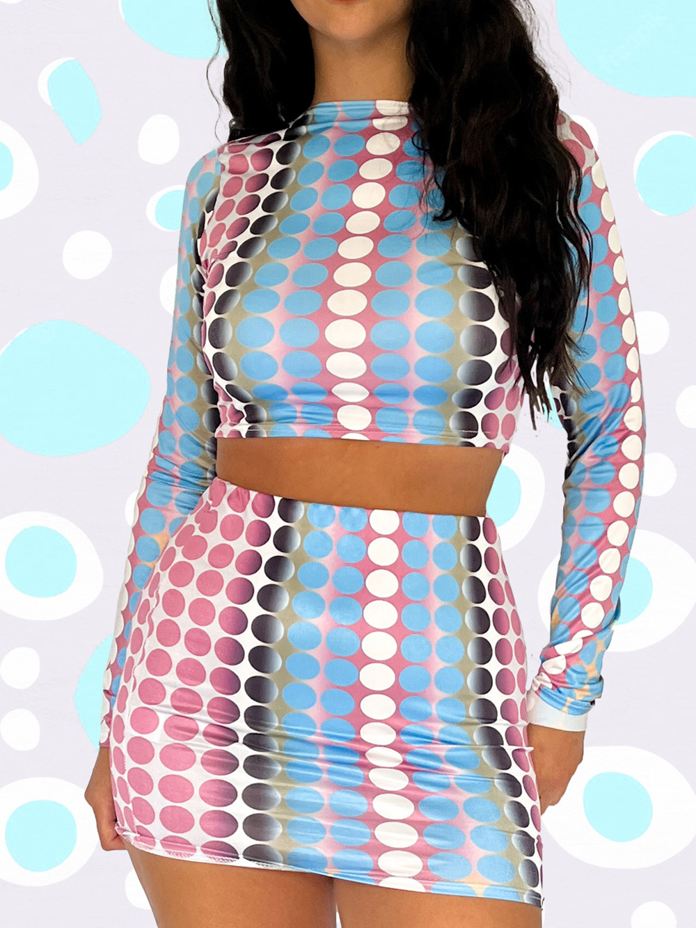 Turn up the tempo in this hypnotic two-piece set. The long-sleeve crop top and matching mini skirt feature a bold, retro-futuristic print that shifts between pastel dreams and rave-ready neon. Designed for movement, this fit is pure Y2K nostalgia meets next-level festival fashion. Step into the groove and let the night take you away. ✨💙